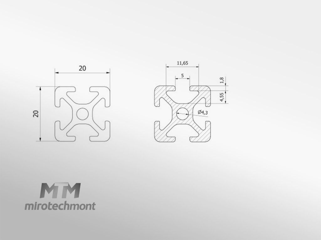 | 20x20 I5 | 6000mm | I5 | 0,49kg/m | 0,74cm⁴ | 0,74cm⁴ | 0,74cm³ | 0,74cm³ | 1,82cm² |