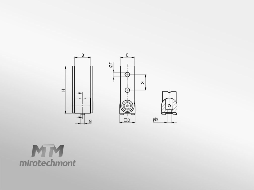 | H (mm) | D (mm) | Slot N (mm) | ØF (mm) | E (mm) | B (mm) | ØS (mm) | Mřížka | G (mm) |