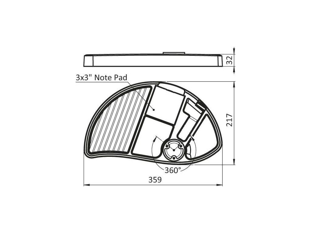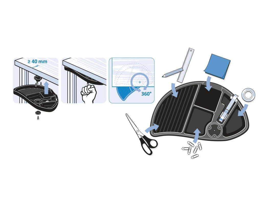 Pro skryté uložení kancelářských potřeb v dosahu pod pracovní deskou, s držákem pro odvíječ lepicí pásky s průměrem jádra 25,4 mm a přihrádkou na samolepicí bločky do velikosti 78 x 78 mm