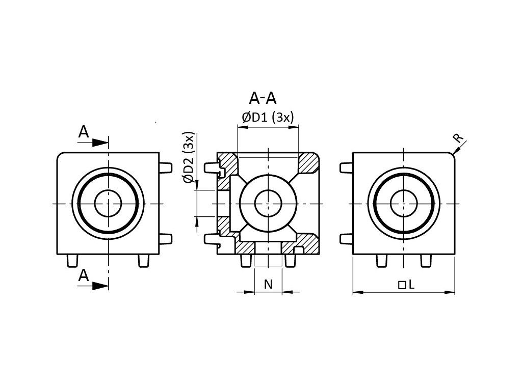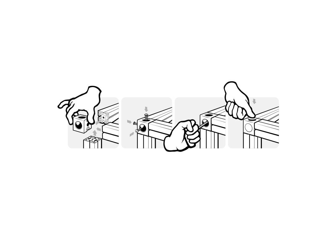 Pro propojení tří hliníkových profilů pod pravým úhlem; s kryty pro zakrytí vrtání