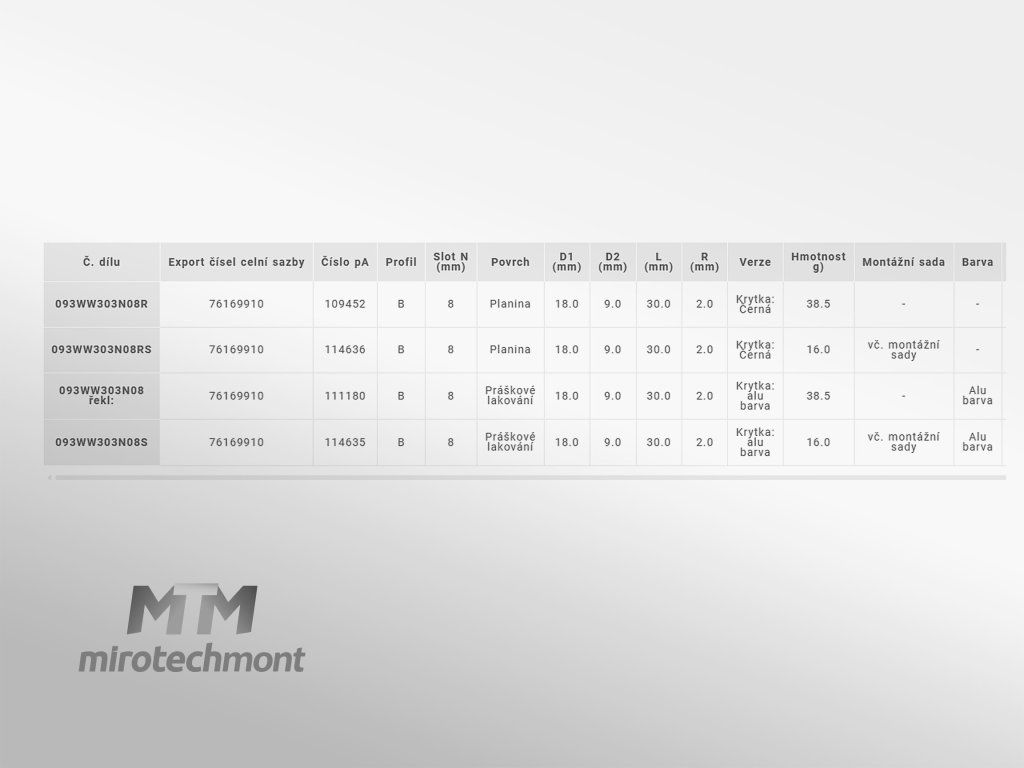 | B | 30.0 | 18.0 | 2.0 | 8 | 9.0 | Barva Alu | Kryt: barva hliníku | Práškové lakování |